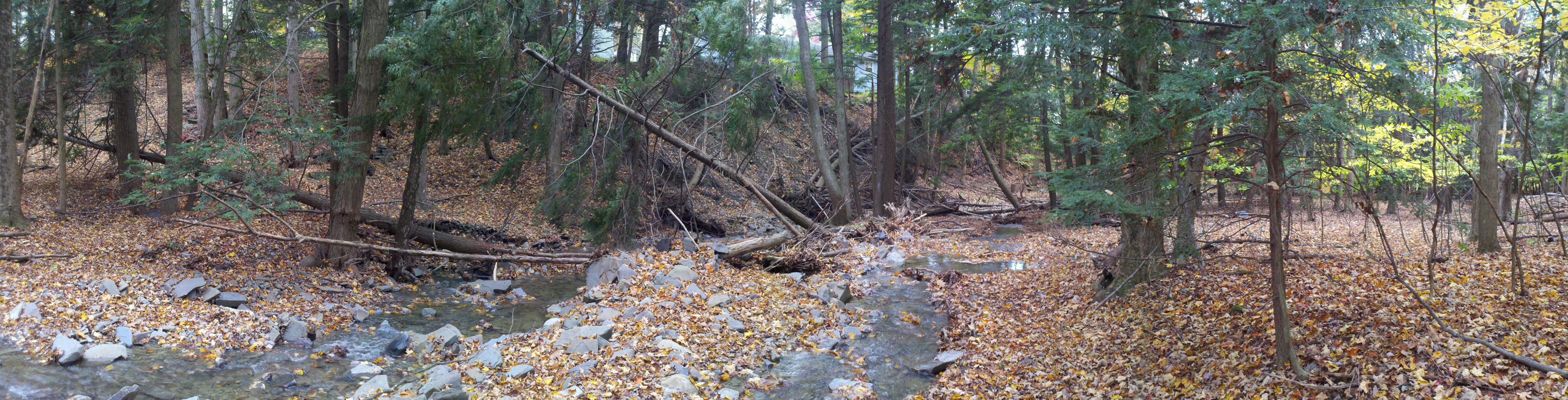 Looking down stream. Note the split. This became more pronounced after the September 7-8, 2011 heavy rainfall. Also some of the trees fell during that event.