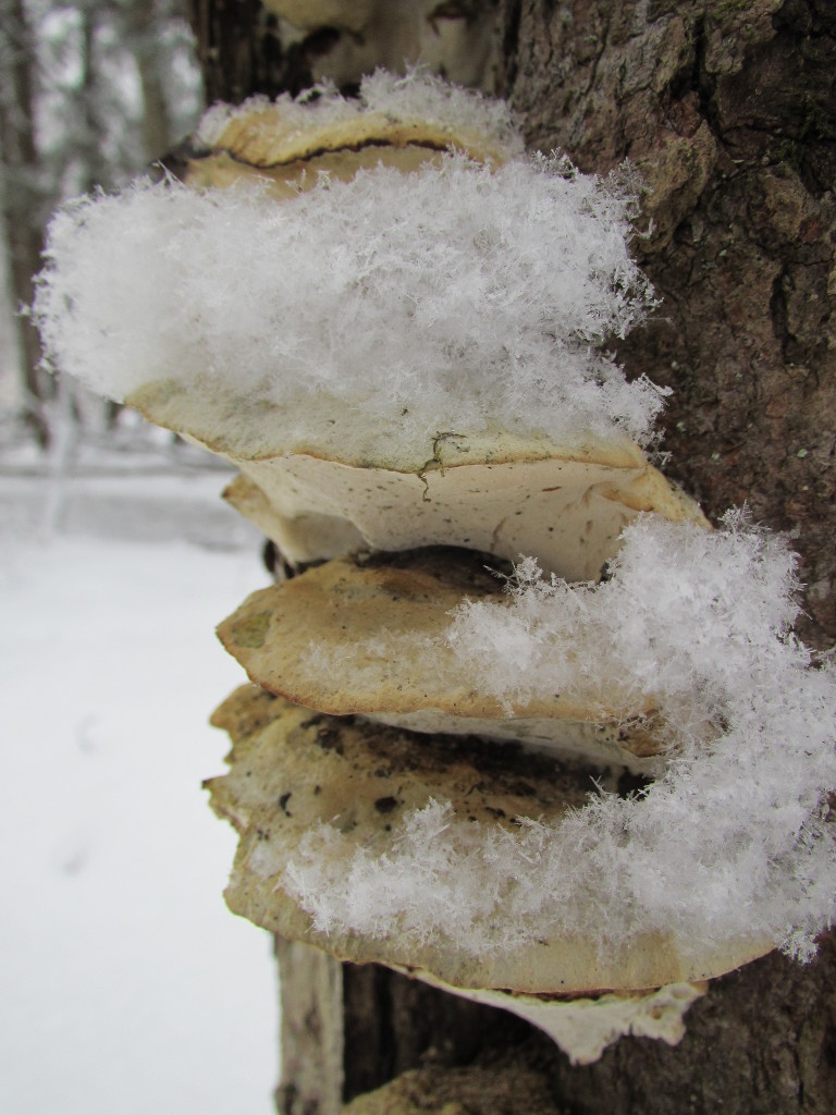 Snow on what I think are called Pleurotus or oyster mushrooms.